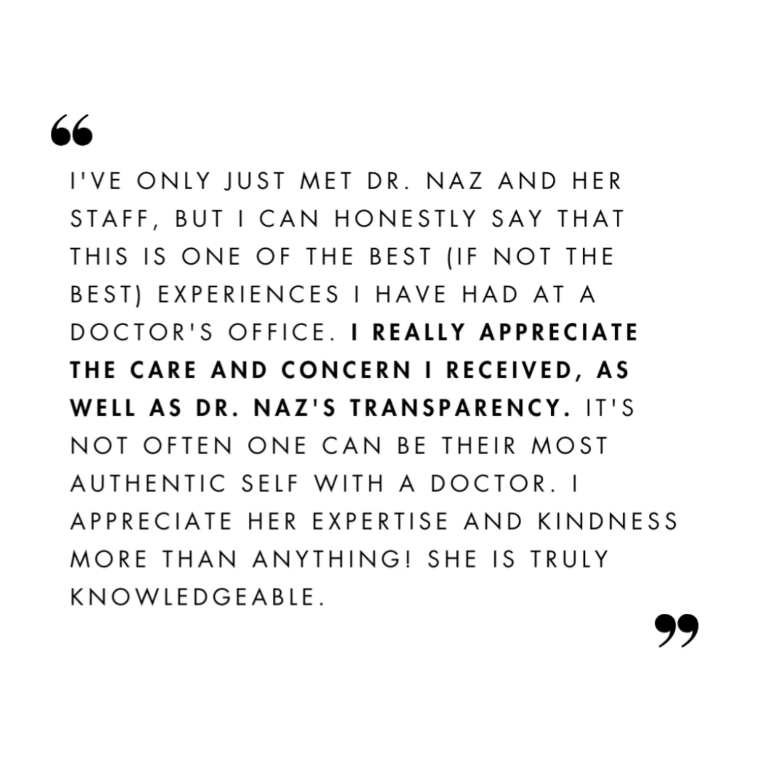 Dr. Naz is the only doctor I’ll trust. She is precise, knowledgeable, and meticulous with her skill set. I highly recommend her.